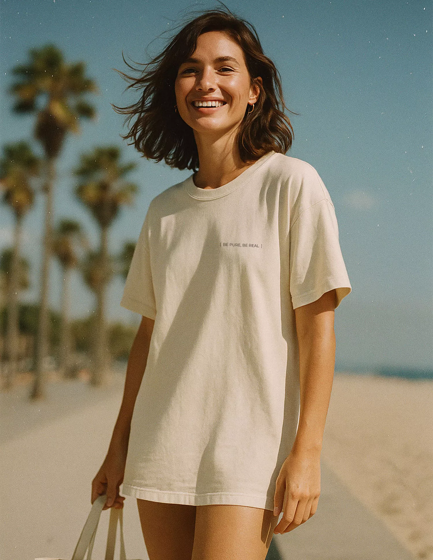 La camiseta unisex de algodón orgánico 200 g/m² de Mimesis Sensations es la prenda ideal para quienes buscan comodidad y conciencia ecológica en su armario. El minimalismo del frontal con el lema “Be Pure, Be Real” contrasta con el humor fresco de la espalda: “Me gustas como el aguacate, aunque al sol te pongas como un tomate”. Con su corte oversize y tejido suave al tacto, se convierte en un básico para looks urbanos con personalidad.