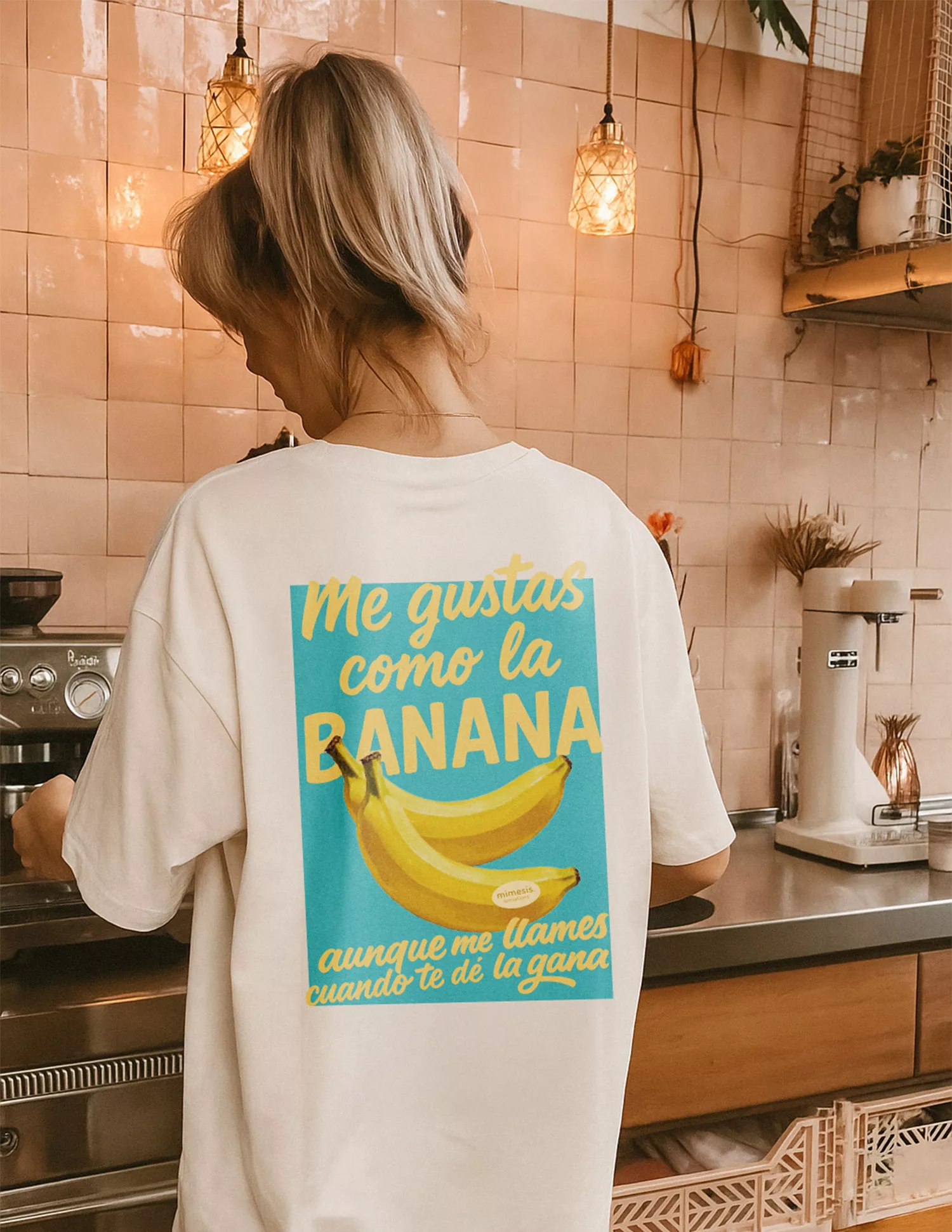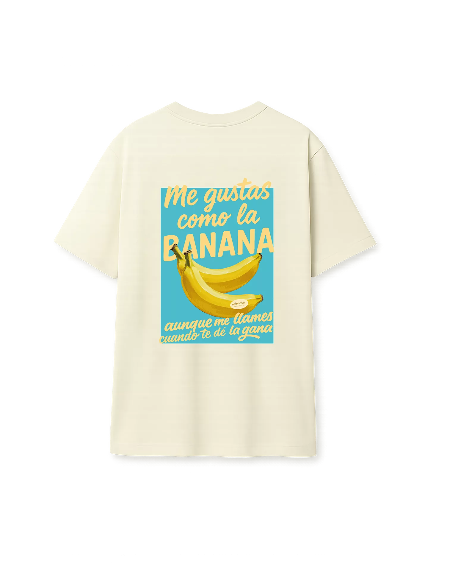 Confeccionada en algodón ecológico de 200 g/m², esta camiseta unisex destaca por su corte holgado y caída natural. En el pecho, el lema “Be Pure, Be Real” marca la filosofía de la marca. Pero es en la parte trasera donde la creatividad estalla: “Me gustas como la banana, aunque me llames cuando te dé la gana”, un guiño divertido y desenfadado que convierte a esta prenda en mucho más que un básico. Ideal para quienes apuestan por moda ética con chispa.