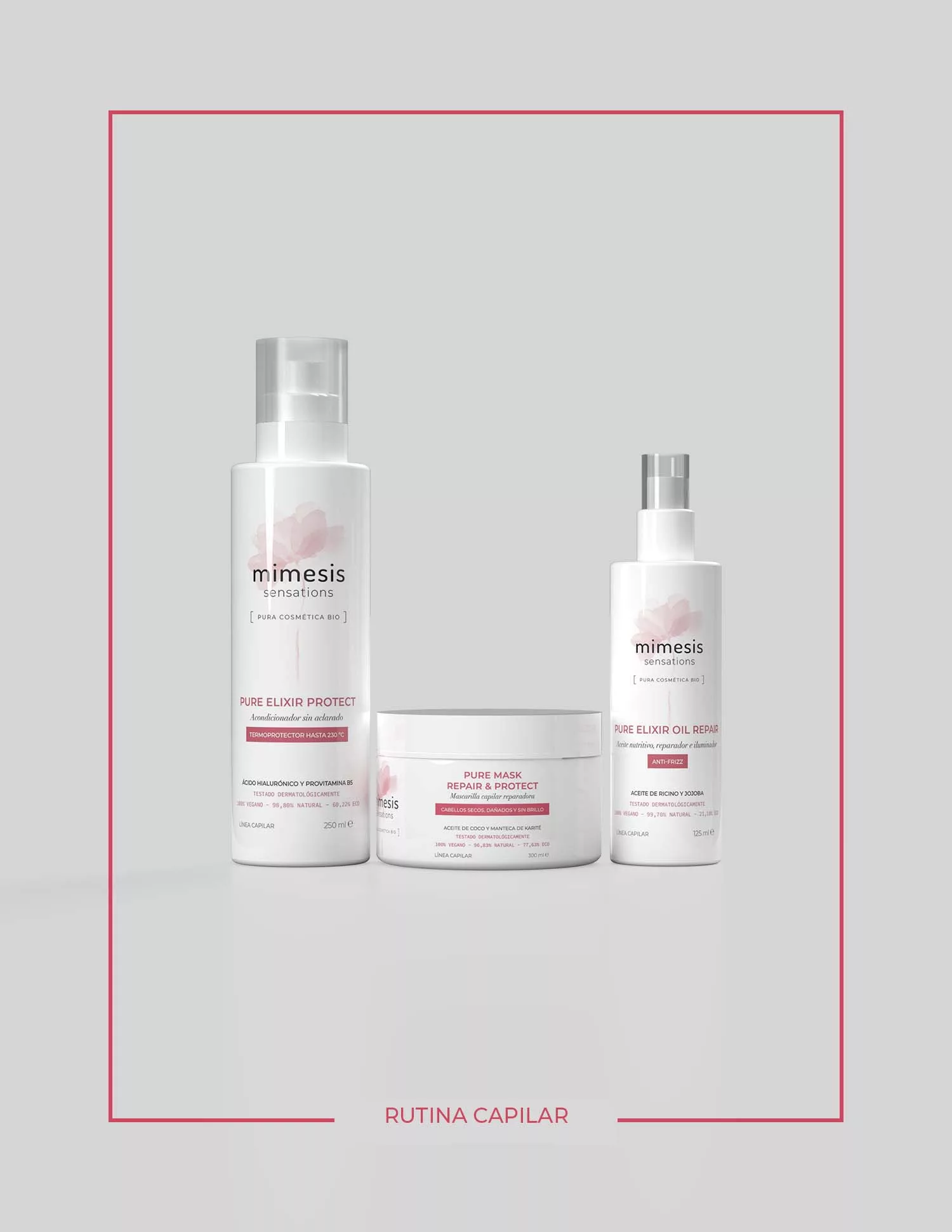 Pure Elixir Oil Repair:  Caprylic/capric triglyceride (emoliente), prunus amygdalus dulcis oil* (aceite de almendras dulces), ricinus communis seed oil* (aceite de ricino), simmondsia chinensis seed oil* (aceite de jojoba), camellia oleifera seed oil* (aceite de camelia), cocos nucifera oil* (aceite de coco), olea europaea fruit oil* (aceite de oliva), opuntia ficus indica seed oil* (aceite de semilla de higo chumbo), amyris balsamifera bark oil (aceite de madera de amyris), lycium barbarum fruit extract* (extracto de goji), calendula officinalis flower extract* (extracto de caléndula), tocopherol (antioxidante), aqua (solvente), propanediol (humectante), glycerin (humectante), potassium sorbate (conservante), sodium benzoate (conservante), parfum (fragancia).  *Ingredientes provenientes de agricultura ecológica. Pure Elixir Protect:  Aloe barbadensis leaf juice* (activo), aqua (solvente), propanediol (solvente), inulin (activo), sodium PCA (antiestático, humectante), panthenol (activo), hydroxyproline (activo), L-proline (activo), sodium hyaluronate (activo), rubus idaeus fruit extract* (activo), zingiber officinale root extract* (activo), xanthan gum (gelificante), glycerin (humectante, solvente), phytic acid (quelante), benzyl alcohol (conservante), potassium sorbate (conservante), sodium benzoate (conservante), parfum (fragancia).  *Ingredientes provenientes de agricultura ecológica. Pure Mask Repair & Protect:  Aloe barbadensis leaf juice* (activo), butyrospermum parkii butter* (activo), maltodextrin (acondicionante de la piel), cetearyl alcohol (emulgente), glycerin (hidratante/solvente), cocos nucifera oil* (activo), behentrimonium chloride (suavizante capilar), crambe abyssinica seed oil (activo), aqua (solvente), benzyl alcohol (conservante), glyceryl caprylate (emoliente), parfum (fragancia), tocopherol (activo, antioxidante), glyceryl undecylenate (emoliente), emblica officinalis powder (activo), inulin (activo), hydrolyzed wheat protein (activo), citric acid (control de pH), potassium sorbate (antioxidante), sodium benzoate (antioxidante), leuconostoc/radish root ferment filtrate (activo), phytic acid (antioxidante, quelante), malva sylvestris flower extract (activo), oryza sativa extract (activo).   *Ingredientes provenientes de agricultura ecológica.