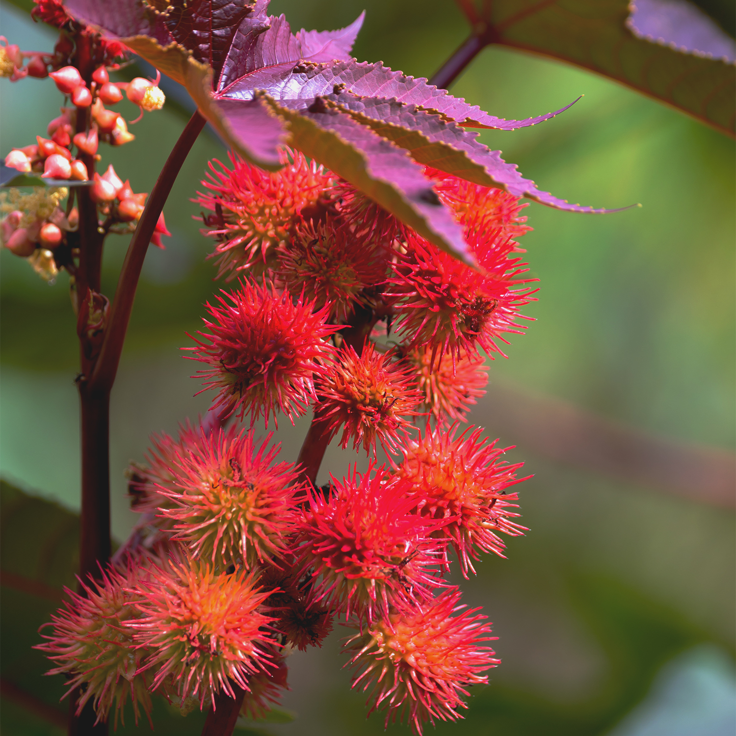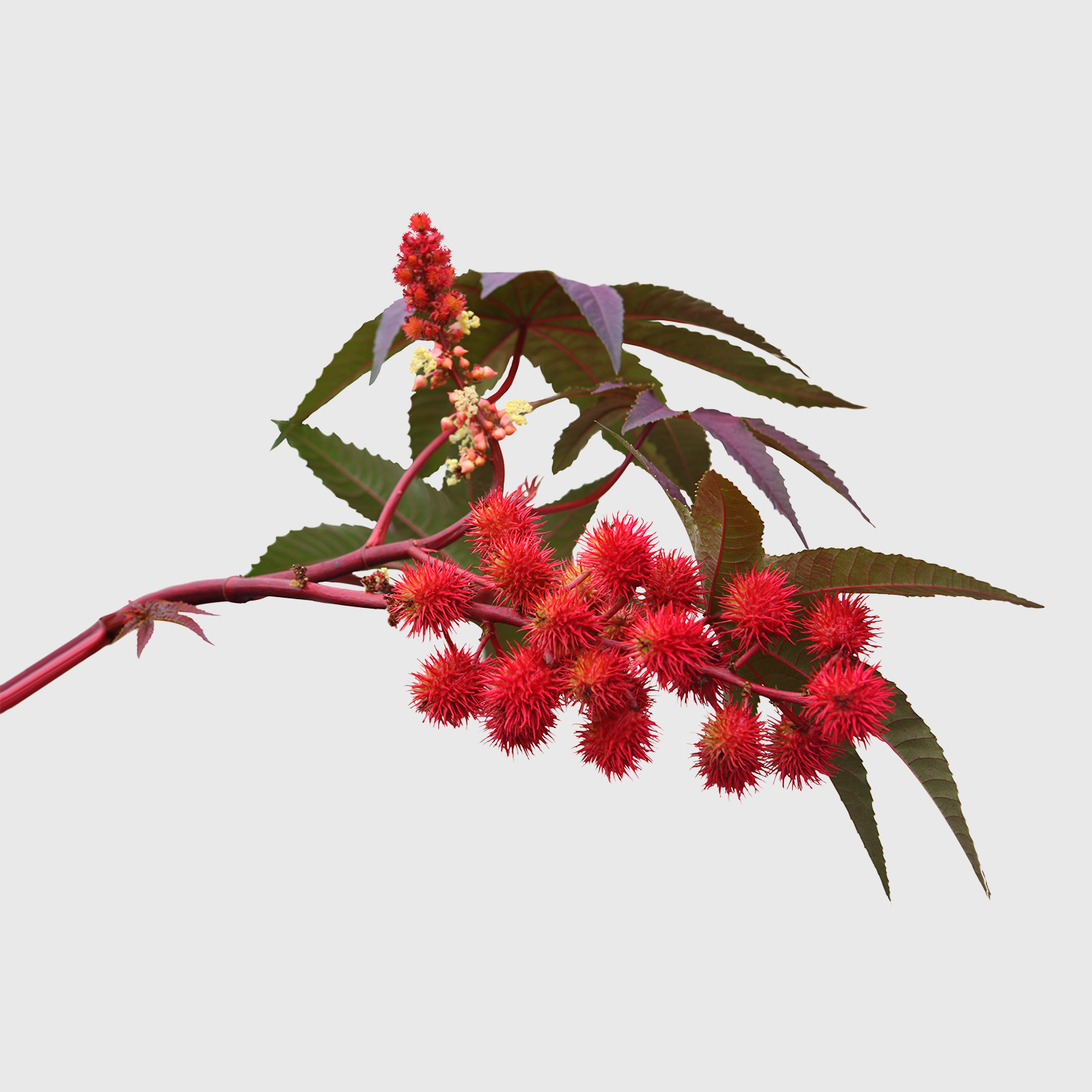 El ricino es una planta originaria de África tropical y oriental. Se cultivó por primera vez en Egipto hace más de 4.000 años y luego se extendió a otras regiones del mundo. El ricino es un arbusto perenne con hojas grandes y palmeadas y produce flores de color verde amarillento o rojizo. El fruto del ricino es una cápsula espinosa que contiene semillas ovaladas y brillantes, conocidas como «habas de ricino”. Destacan por su alto contenido de aceite, que se extrae mediante un proceso de prensado en frío.